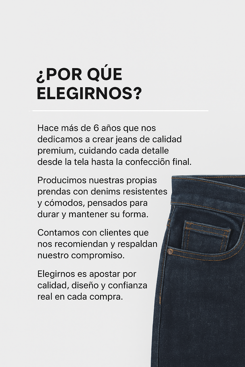Cada prenda que ofrecemos refleja nuestro compromiso con la excelencia. Desde la selección de los materiales hasta los detalles de confección, cuidamos cada paso del proceso para garantizarte estilo, confort y durabilidad. Conocé los valores que nos definen y hacen que cada jean sea una elección segura.